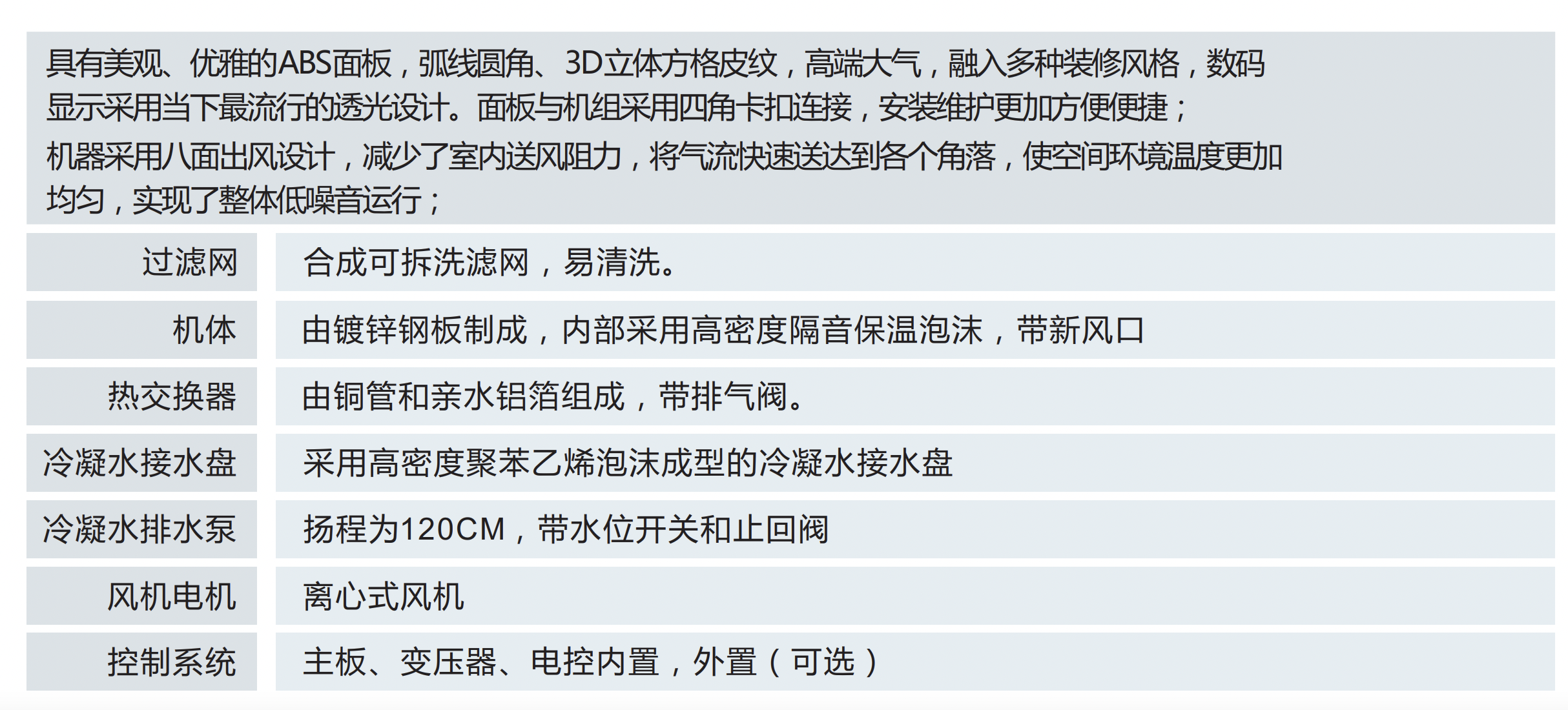 具有美觀、優(yōu)雅的ABS面板,弧線圓角、3D立體方格皮紋,高端大氣,融入多種裝修風(fēng)格。面板與機組采用四角卡扣鏈接,安裝維護更加方便便捷。
